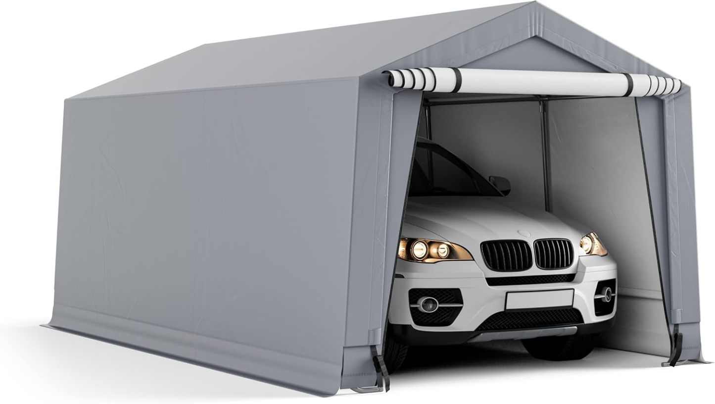 【Structure en acier galvanisé】Le garage portable est soutenu par des poteaux en acier galvanisé robuste qui ne sont pas faciles à rouiller, à fissurer ou à abîmer. De plus, les poutres renforcées triangulaires supérieures et les 8 pieds offrent un soutien solide et rendent la tente plus stable.