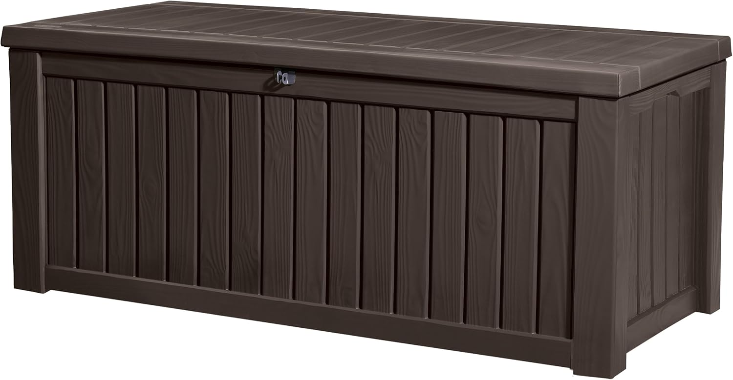 Coffre de rangement extérieur de 570 L en polypropèlène traité anti UV. Résiste aux intempéries. Etanche, verrouillable, assise pour deux personnes. Vérins pour faciliter l'ouverture du couvercle.