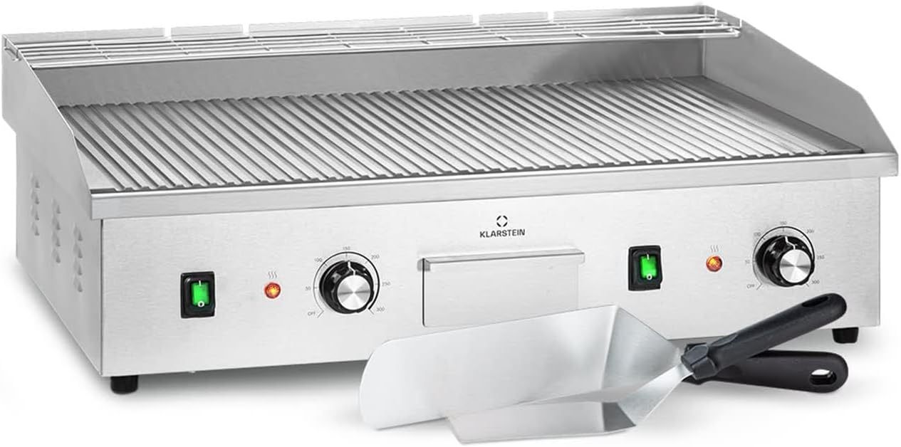 Klarstein Barbecue Electrique de Table, Plancha Electrique Exterieur, Grill Electrique Antiadhésive Amovible, Affichage LED et 2 Spatules, Acier Inoxydable pour Camping et Restaurant, 200W (Argent) De délicieuses spécialités directement sur le grill sont rendues possibles par le grill électrique Klarstein Grill Mile 4400 - idéal pour équiper les food trucks, les snacks, les restaurants, les bars ou les stands de marché dans le secteur de la restauration. Nettoyage facile de la plancha électrique Vous pouvez cusiner avec un minimum de tracas grâce à ce gril qui à une cuisson rapide et facile à nettoyer grâce à son bac de récupération des graisses amovible qui recueille l'excès d'huile et les résidus alimentaires. Faites cuire des aliments tels que de la viande, des légumes et des œufs sur la surface plate qui brunit les aliments à l'extérieur tout en les gardant juteux et pleins de saveur à l'intérieur. Protection contre les éclaboussures de graisse et d'huile chaudes Cette plancha électrique d'extérieur a été conçue avec des protections supplémentaires contre les éclaboussures sur les côtés et à l'arrière de la plaque pour vous protéger complètement, ainsi que les murs environnants, contre les éclaboussures de graisse et d'huile chaudes pendant la cuisson.Caractéristiques du produit : - Boîtier en acier inoxydable - Puissance : 2 000 watts - Plaque de grill lisse en fonte - Protection contre les éclaboussures - Pieds en caoutchouc antidérapants