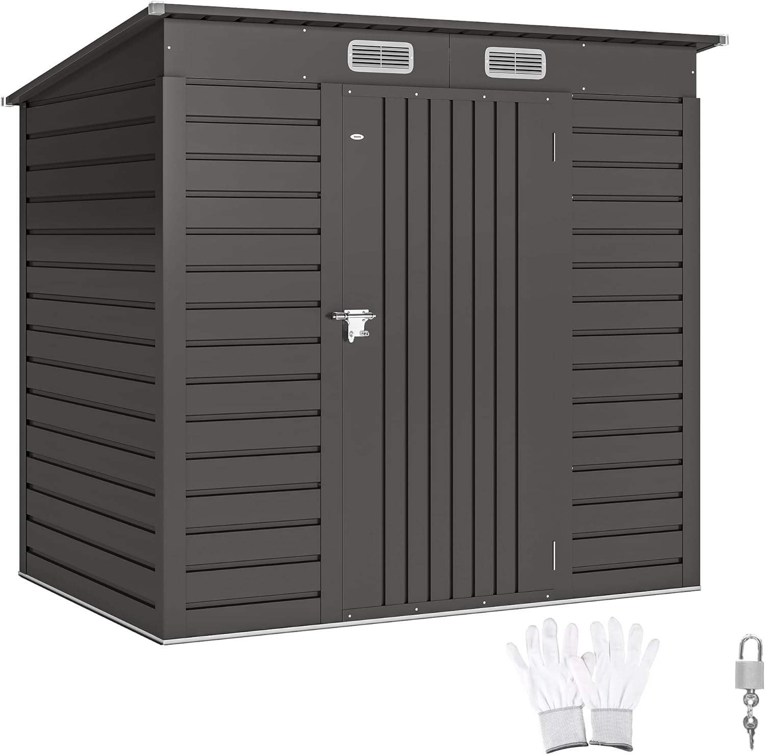 ACCÈS AISÉ : Doté de doubles portes s'ouvrant en grand et d'une rampe d'accès, cet abri de jardin facilite le rangement de vos outils et l'entrée d'objets roulants. Équipé d'un verrou pour plus de sécurité, cadenas et clés fournis.